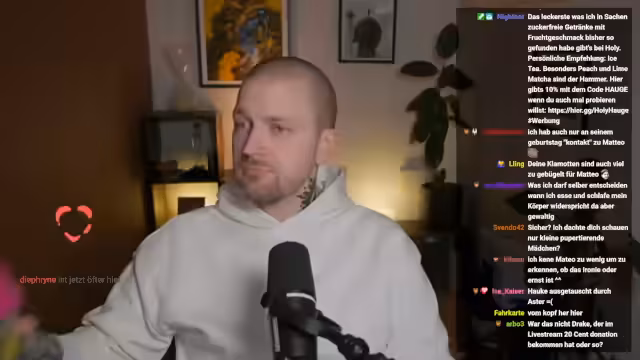 00:54:55Der Stream springt zu verschiedenen Alltagsdramen im Internet, darunter der Streamer "Matteo" und seine Geschäfte mit Spenden. Es wird diskutiert, wie sich Spenden auswirken können, und der Streamer teilt seine persönliche Haltung zu finanziellen Unterstützungen. Er gibt an, selten große Spenden zu erhalten und seine Spendenfunktion im Grunde als Zeichen der Mündigkeit seiner Zuschauer zu sehen.