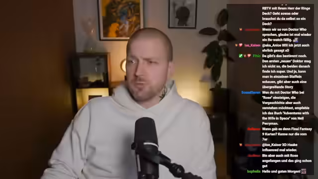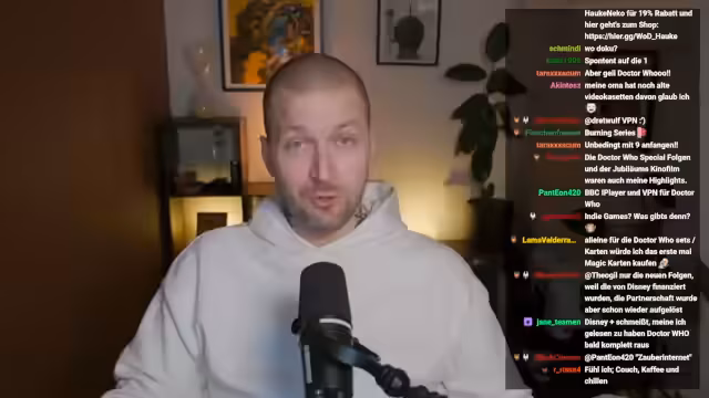 01:04:01Es wird über die Serie Doctor Who diskutiert, insbesondere über den Einstiegspunkt für neue Zuschauer. Der Streamer plant, die Serie zu schauen und fragt nach Möglichkeiten, sie zu streamen oder zu kaufen, wobei er verschiedene Plattformen wie Amazon und Unext in Japan erwähnt. Er äußert sich begeistert über Doctor Who-Karten, die ihn motiviert haben, die Serie anzusehen. Parallel dazu kündigt er an, in den nächsten fünf Minuten mit einer Dokumentation zu beginnen, bevor später ein Indie-Game gespielt wird. Es wird auch ein mögliches Showmatch gegen Mara von RBTV mit einem Herr-der-Ringe-Deck erwähnt, wobei die Kompatibilität der Decks und Spielmodi (Standard vs. Commander) erörtert werden.