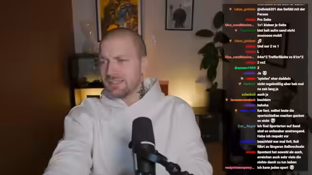 01:22:34Die Diskussion dreht sich um verschiedene Sportarten, beginnend mit Volleyball und Beachvolleyball. Der Streamer fragt nach den Regelunterschieden und der Bedeutung des kleineren Feldes beim Beachvolleyball, wobei die Quadratmeterzahl als entscheidender Faktor für die Mobilität im Sand genannt wird. Es wird die Beobachtung geteilt, dass viele, die Sportschießen schauen, auch selbst Sportschützen sind, was bei Beachvolleyball ähnlich vermutet wird. Bouldern wird scherzhaft als 'Religion' bezeichnet. Der Streamer gibt zu, selbst nicht viel Sportschießen zu verfolgen, außer Rapid Pistol Fire bei der WM. Die Unterhaltung zeigt ein breites Interesse an verschiedenen sportlichen Aktivitäten und deren Besonderheiten, wobei der Fokus auf den persönlichen Erfahrungen und der Wahrnehmung der Zuschauer liegt.