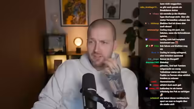 01:28:32Die Diskussion wendet sich den Wintersportarten zu, wobei der Streamer seine Schwierigkeiten mit Wintersport im Allgemeinen äußert. Er findet Curling 'ganz geil' und 'cool zum Zugucken', während Skispringen ihn leider nicht interessiert. Biathlon wird als 'super interessant' und gelegentlich anschaubar beschrieben. Eishockey wird kritisch betrachtet, da die 'überzogene Gewalt' und die ständigen Schlägereien den Sport für ihn unattraktiv machen und den eigentlichen Sport stören. Er vermutet, dass Eishockey-Fans dies anders sehen könnten. Es wird auch der norddeutsche Sport Boßeln erwähnt, der sogar eine WM hat. Die Meinungen im Chat spiegeln die unterschiedlichen Ansichten über Sport und Gewalt wider, wobei der Streamer seine persönliche Abneigung gegen unnötige Aggression im Sport betont.