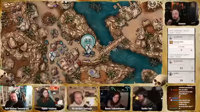 01:08:39Nachdem die Gruppe geschlafen hat, wacht Katha noch immer mit einer Erschöpfung auf, während die anderen ausgeschlafen sind. Beim Frühstück im Gasthaus stellt die Gruppe fest, dass die Vorräte knapp werden und die Handelsrouten unterbrochen sind. Gleichzeitig wird eine Gruppe bewaffneter Halblings beobachtet, die sich wegen eines riesigen Krokodils namens Snugglesnaut, das sich im Weg befindet, unsicher sind, ob sie zur Jagd aufbrechen sollen. Brenn wirkt mit Magie eine positive Verstärkung auf einen der Halblings, was das Gruppenklima hebt.