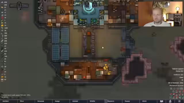 01:52:29Das Management der RimWorld-Kolonie erfordert strategische Entscheidungen. Der Streamer ringt mit dem Platzmangel und der Lagerverwaltung, während er verspricht, mehr Stauraum und bessere Tierhaltung zu schaffen. Ein Kolonist namens Leon leidet unter einer Herzschwäche und braucht dringend eine medizinische Operation. Die Prioritäten liegen klar auf der Verbesserung der Lebensbedingungen, weshalb das Gefängnis abgerissen und die Basis umstrukturiert wird, um ein zusätzliches Bett zu bauen und die Raumqualität zu erhöhen, insbesondere durch den Abbau von Tierkot und die Installation von Heizungen.