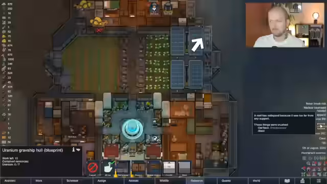 02:07:05Der Fokus des RimWorld-Spiels verlagert sich auf die massive Erweiterung des Raumschiffs 'JSS Arschbolzen', indem nicht benötigte Gegenstände wie Waffen eingeschmolzen und Ressourcen wie Stahl clever gelagert werden, um Platz zu schaffen. Gleichzeitig bereitet die Kolonie auf eine unbekannte Bedrohung vor, weshalb ein EMP-Launcher gebaut wird, um Gegner außer Gefecht setzen zu können. Die Ausbaupläne sind ambitioniert und umfassen die Installation von Feuerlöschern, Lampen und die Optimierung der Raumnutzung, um eine funktionale Festung zu schaffen.