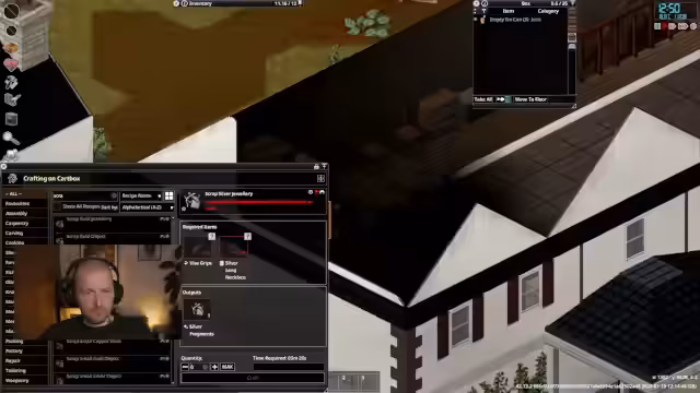 02:01:00Es folgt ein Fokus auf die Skill-Entwicklung, insbesondere auf Napping und Tailoring. Der Streamer erkundert die Herstellungsmöglichkeiten und stellt fest, dass er ohne das entsprechende Skillbuch nichts produzieren kann. Gleichzeitig beschwert er sich über die veränderten Mechaniken in Build 42, bei denen das Zerlegen von Kleidung keine Erfahrungspunkte mehr bringt. Er experimentiert mit den Menü-Einstellungen, um die Benutzeroberfläche übersichtlicher zu gestalten, und beginnt, Materialien für das Napping-Skill vorzubereiten.