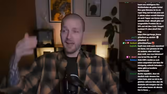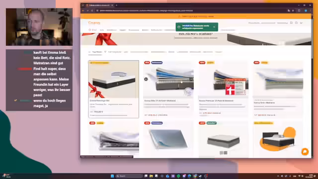 01:51:29Neue Kooperation mit Emma Matratzen wird vorgestellt: Bis Weihnachten gibt es 50% Rabatt auf ausgewählte Produkte sowie zusätzliche 5% mit Code 'Hauge5'. Der Streamer empfiehlt Matratzen, Topper und Kissen aus eigener, jahrelanger Nutzungserfahrung. Besonders hervorheben wird die Anpassbarkeit der Kissen (entnehmbare Layer) und die 100-Nächte-Testphase mit kostenloser Rücksendung. Partnerschaften ermöglichen ihm dauerhaftes Streaming, da es im Vergleich zu Content-Erstellung finanziell ineffizient ist.