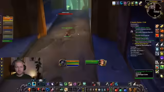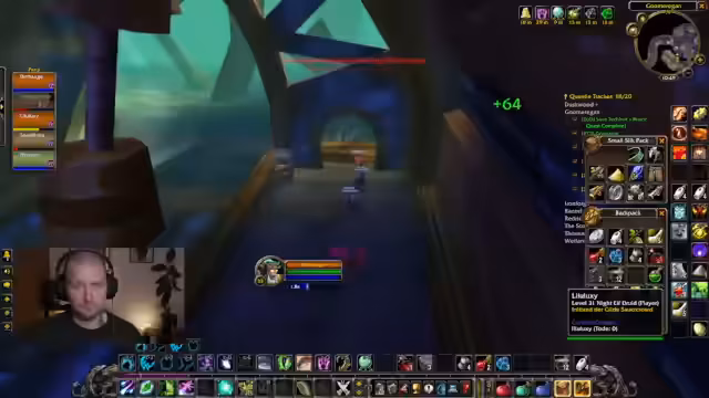 03:08:25Nachdem die Gruppe alle Questobjekte für Gnome Regan gesammelt hat, macht sie sich auf den Weg. Es gibt noch Diskussionen über die Teilnahme eines anderen Gildenmitglieds, Toro, dessen Rolle als Heiler in der Gruppe als sinnvoll erachtet wird. Während des Laufs wird die Kommunikation über 'GuildenCenter' organisiert. Die Gruppe startet letztendlich mit einer festen Besetzung.