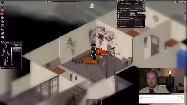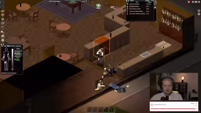 02:30:26Die Project Zomboid Session beginnt mit den Quests: 'Nur die Liebe zählt' (Überleben mit NPC), 'Game of All Life' (PC-Setup beschaffen), 'Rauchen ist uncool' (max. 7 Kippen), 'Fanservice' (oberkörperfrei überleben), 1000 Dollar legal verdienen und Tagebucheintrag pro Spieltag schreiben. Der Streamer zieht das Shirt aus (Crop Top ist erlaubt). Der NPC verschwindet aufgrund eines Bugs direkt am Anfang. Der Run wird trotzdem fortgesetzt, aber die Hauptquest (Überleben mit NPC) ist nicht mehr machbar. Es werden Kippen und ein Penlight im Angelladen gekauft. Es wird versucht, mit dem Angler Geld zu verdienen, indem Fische gefangen werden. Es wird festgestellt, dass man die Fische im Kühlschrank des Restaurants lagern muss. Es wird versucht, Fische zu fangen und im Restaurant zu verkaufen, um die Quest 'Verdiene 1000 Dollar legal' zu erfüllen, aber es stellt sich heraus, dass dies nicht funktioniert. Es wird ein Supermarkt besucht, um Papier und Stift für den Tagebucheintrag zu finden. Der Streamer wird angeschossen und muss sich verbinden. Es wird nach einer Nadel gesucht, um die Wunde zu verschließen, aber erfolglos. Der Plan, 1000 Dollar legal zu verdienen, wird weiterverfolgt, indem versucht wird, im Supermarkt einzukaufen und die Ware dann teurer zu verkaufen. Es wird ein Hammer im Müll gefunden.