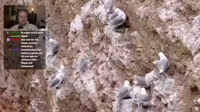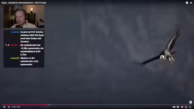 00:08:16Der Streamer kündigte den Doku-Donnerstag an und wählte die Dokumentation "Die Superkräfte der Vögel" aus. Es gab kurzzeitig Probleme mit dem Browserfenster, aber diese konnten schnell behoben werden. Während der Doku wurde im Chat über verschiedene Aspekte der Vogelwelt diskutiert, darunter die Evolution des Fliegens, die unterschiedlichen Flugtechniken von Vögeln, Insekten und Fledermäusen, sowie die Auswirkungen des Asteroideneinschlags auf die Vogelpopulation. Ein weiterer Diskussionspunkt war die Frage, welches Tier die schnellste Fortbewegung erreicht, wobei neben dem Wanderfalken auch die Pistolengarnele genannt wurde. Der Streamer korrigierte sich selbst, nachdem er zunächst fälschlicherweise eine Möwe als schnellsten Vogel bezeichnet hatte. Es wurde auch über die V-Formation von Gänsen und die Kommunikation von Staren in großen Schwärmen gesprochen. Der Streamer erwähnte den Film "Wild Robot" als Empfehlung für die Zuschauer.