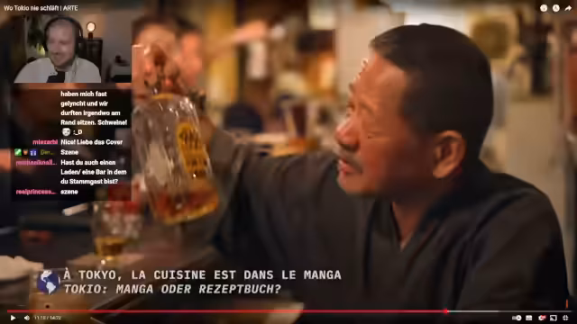 02:00:33In Tokio gibt es unzählige kleine Bars und Kneipen, sogenannte Yokocho, die als soziale Treffpunkte dienen. Besonders in Golden Guy, dem Vorbild für den Manga, werden Whiskyflaschen mit den Namen der Stammgäste beschriftet. Diese Lokale dienen als Ventil für beruflichen und privaten Druck und sind wichtige soziale Räume, da zu Hause wenig Raum für soziale Interaktion bleibt. Die Atmosphäre in solchen Bars vermischt Schicksale und ermöglicht Begegnungen zwischen Menschen aus verschiedenen Lebensbereichen.