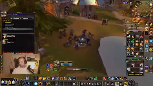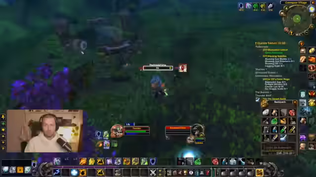 03:11:56Der Fokus verlagert sich auf das Farmen von Lightning Glans und Thunderhawk Saliver Glans in Dustwallow Marsh. Der Spawn-Pool mit den Hyänen und den Stormhide-Raptoren wird als problematisch beschrieben, da die Hyänen oft unberührt bleiben und das Farmen erschwert. Der Streamer wird von Gildenmittern getragen, was ihm wenig Ehre einbringt.