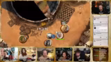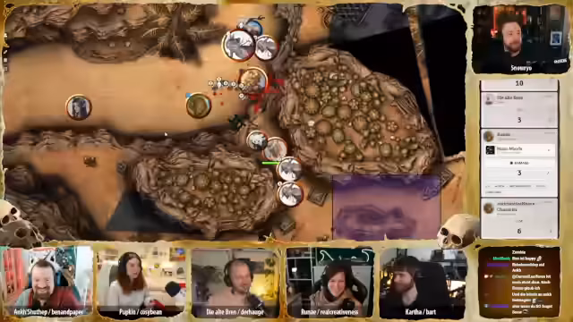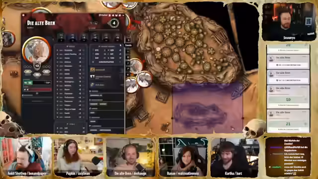 00:45:25Der Streamer beginnt die Pen & Paper Session, 'Desert Doom Session 15', mit der Gruppe. Die Charaktere machen sich auf den Weg zur Farm, wobei sie auf verschiedene Herausforderungen stoßen: einen Minotauren mit einer flammenverzierten Flöte, Statuen alter Geister und normale Geier. Die Gruppe lernt, dass die Geier durch das Auge im Hals Knochen fressen und sich dadurch verändern. Bei der Ankunft an der Farm entdecken sie erste Anzeichen des Fluchs: Käfer, Verwesung und eine von einer Zombie-Halblingsfrau bewohnte Farm.
