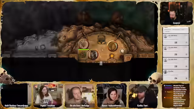 00:30:07Herzlich willkommen zur sechsten Session von Desert Doom. Der Streamer stellt den aktuellen Spielstand vor: Tag 11 des Abenteuers. Charaktere sind in einem Haus der Aufmerksamkeit und kämpfen gegen einen untoten Krieger namens Tobrel. Die Situation ist kritisch, da eine Figur verletzt an einer Leiter hängt, fliegende Schwerter angreifen und eine riesige Eisenrüstung auferstanden ist. Tobrel zeigt bereits Schäden durch die Kämpfe und verliert seine menschliche Gestalt.