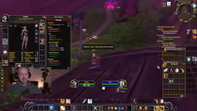 01:44:12Das Duo beginnt mit ersten Quests im Nachtelfen-Startergebiet. Sie kämpfen gegen Teufelsmoos und Nachtsäbler, sammeln Beute und steigen Level auf. Der Hauptspieler kommentiert die Effizienz des Priesters mit minimalem Mana-Verbrauch. Diskutiert werden Klassen-Mechaniken: Priester sind stabil durch konstanten Schaden und Heilung, haben aber keine starken Panik-Buttons. Die Quests sind typisch für Classic – langatmig mit schleppendem Item-Loot.