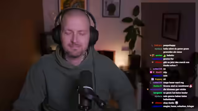 03:01:38Die Diskussion dreht sich um die Wahl der Nachtelfen-Rasse und die damit verbundenen Kompromisse. Es wird bedauert, dass andere Rassen wie Tauren oder Zwerge nicht verfügbar waren, und erklärt, dass bei einem ehrlichen Testergebnis eigentlich ein Zwerg die bessere Wahl gewesen wäre. Gleichzeitig wird die Entscheidung für die Nachtelfen verteidigt, da man grundsätzlich mit dem Partner spielen wollte. Die Gruppe bemerkt den schnellen Levelaufstieg und diskutiert über Klassenmechaniken, wobei deutlich wird, dass Heil-Klassen als Priestertum als weniger reizvoll empfunden werden.