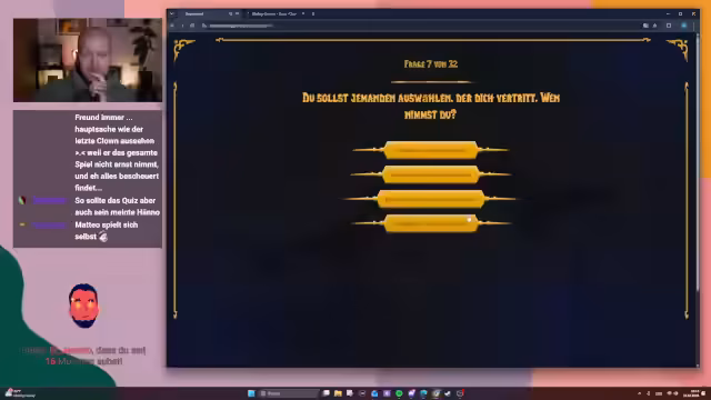 01:59:02Die Spieler diskutieren über die Mechaniken von Heilig-Schaden und Questinteraktionen. Sie planen, eine Höhle zu betreten, um Eier zu sammeln, bemerken aber, dass die Quest dafür noch nicht aktiviert ist. Dabei wird die Logik hinter Fraktionsauswahl thematisiert: Entgegen der Annahme, man solle ehrlich antworten, um eine bunte Mischung zu erhalten, manipulieren viele Spieler ihre Antworten, um gezielt Nachtelfen zu werden. Diese Erkenntnis führt zu humorvoller Enttäuschung, da der Streamer eigentlich dachte, sein Spielpartner hätte nur wegen ihm Nachtelfen gewählt.