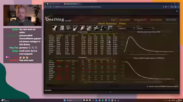 01:03:28Der Event-Start ist für den 27. um 12 Uhr deutscher Zeit geplant. Der Streamer reflektiert über die Spielzeit vieler Teilnehmer und merkt an, dass zu hohe Spielzeiten nicht automatisch Qualität bedeuten. Abschließend wird die Klassenbalance diskutiert: Krieger skalen später extrem gut, während Hexenmeister statistisch die höchste Sterberate aufweisen.