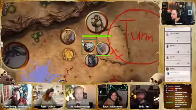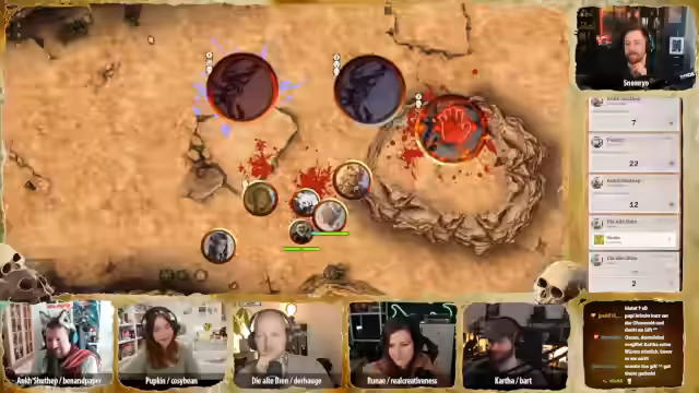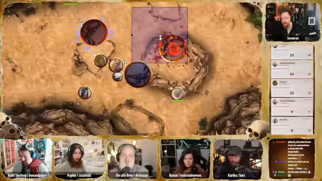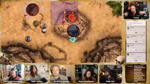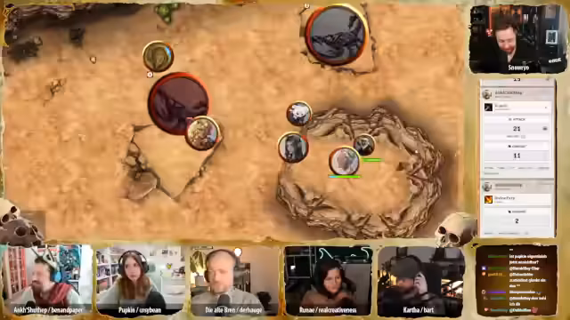 01:19:06Der Stream startet mit der Überlegung, den Zauber Shade Away zu nutzen, was jedoch nicht weiter verfolgt wird. Stattdessen beschließt die Gruppe, sich vom Skorpion zu disengagen, um einer Attacke zu entgehen. Gleichzeitig wird der Zauber Candy Shower gewählt, um den Gegner mit spektralen Süßigkeiten anzugreifen und ihn potentially zu blenden. Für einen Angriff auf die Schwachstelle des Skorpions wird ein Nature-Check mit Vorteil gewürfelt, um das Verhalten der Kreatur zu verstehen. Dabei werden alte Geschichten über Kämpfe zwischen Skorpionen und anderen Wüstentieren erinnert.