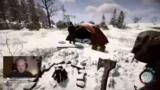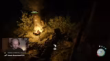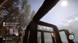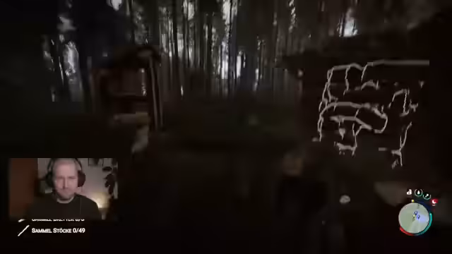 00:46:30Nachdem die technischen Probleme gelöst sind, beginnt das gemeinsame Spielen von Sons of the Forest. Die drei Charaktere spawnen in einer schneebedeckten Landschaft und entdecken schnell einen Helikopter-Absturz. Sofort nach dem Betreten der Welt beginnen sie, Ressourcen wie Holz, Fische und Granaten zu sammeln. Dabei werden sie von einem nicht steuerbaren NPC begleitet, den sie mit sich herumtragen. Der Fokus liegt zunächst auf dem Erkunden der Umgebung, dem Bauen eines Basislagers und der Jagd auf Tiere wie Schneehasen.