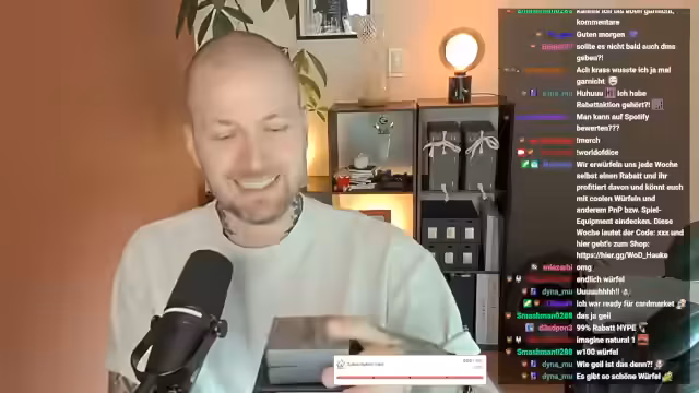 00:29:55Im Zuge der Vorstellung wird die erste Rabattaktion gestartet. Der Streamer würfelt digital und landet auf dem Wert 10, was einen 10%-Rabatt für die Woche bedeutet. Er verkündet den Gutscheincode 'Hauge10' für alle Zuschauer. Dabei erläutert er die Modalitäten der dreimonatigen Kooperation: Er wirft jede Woche, der Rabatt ist mindestens 10% und steigt mit dem Würfelergebnis. Es gibt technische Unstimmigkeiten bei der Anzeige des Codes im Chat, die der Streamer jedoch schnell zu lösen scheint, indem er den Code manuell anpinnt. Ein kleiner Scherz bezieht sich darauf, dass seine physischen Würfel vom Partner noch beim Zoll hängen, was die digitale Würfelaktion notwendig macht.