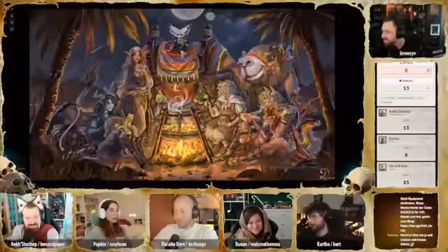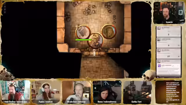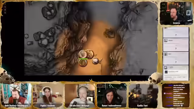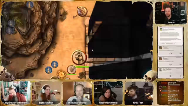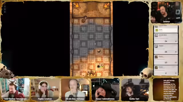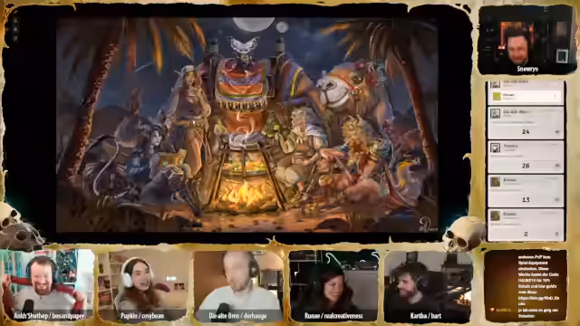 01:32:00Der Streamer begrüßt die Zuschauer offizially zur 23. Session des Pen & Paper-Rollenspiels 'Deserts Doom'. Die Gruppe, bestehend aus Katha, Pupkin, Brenn, Anke, Runay, Hügelchen und Bonifatius, berichtet von den letzten Ereignissen: Sie haben eine Hexe besiegt, erfahren, dass Runays Bruder wahrscheinlich der böse Pharao ist, und wurden mit einem Gift angegriffen. Nachts, während sie in der Wüste reiten, werden sie von mysteriösen Stimmen des Pharao verfolgt, die ihnen befehlen umzukehren.