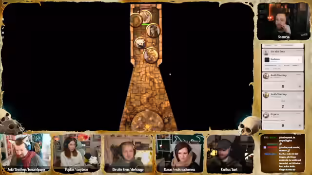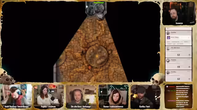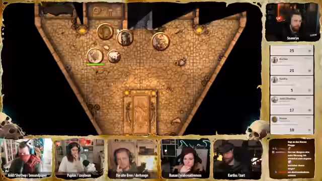 03:24:23Die Gruppe diskutiert über Fertigkeiten und Taktiken. Es geht um einen verlorenen Finger, den Versuch, einen Charakterarm nützlich zu machen, und die tiefe Angst, die im Raum durch eine gefahrvolle Situation mit einem bewusstlosen Gruppenmitglied ausgelöst wurde. Die Stimmung wurde durch unerwartete Würfelergebnisse und den permanenten Druck in der Situation geprägt, was zu einer sehr angespannten und aufregenden Atmosphäre führte.