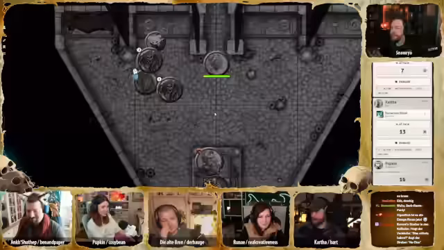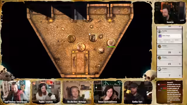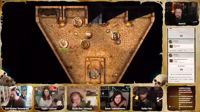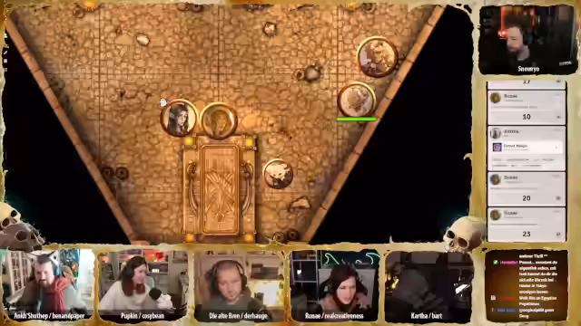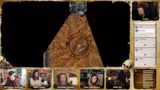 00:33:33Nach technischen Vorbereitungen und dem Anspielen des Intros beginnt das eigentliche Pen & Paper-Spiel. Die Charaktere befinden sich in einer Grabkammer und sind vorsichtig, da sie Fallen und magische Fallen vermuten. Laternen flackern, und unheimliche Geräusche ertönen aus dem Raum. Die Spieler erkunden die Umgebung mit großer Vorsicht und stoßen auf eine zentrale Skulptur mit einem leuchtenden Topaz.