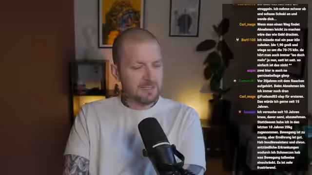 00:38:59Der Streamer erzählt von seiner dramatischen Gewichtsreduktion von 113 auf 73 Kilo auf einer Größe von 1,70 Metern. Er schildert seine Methoden – das rigorose Kalorienzählen und tägliche Spaziergänge – und gibt zu, dass es ihm schwerfällt, das Gewicht konstant zu halten. Diskutiert wird der Einfluss von Beziehungen auf das Körpergewicht, wobei der Streamer vermutet, dass neue Beziehungen oft zu Gewichtszunahme führen können. Persönliche Sorgen über die körperliche Verfall im Alter werden ebenfalls angesprochen.