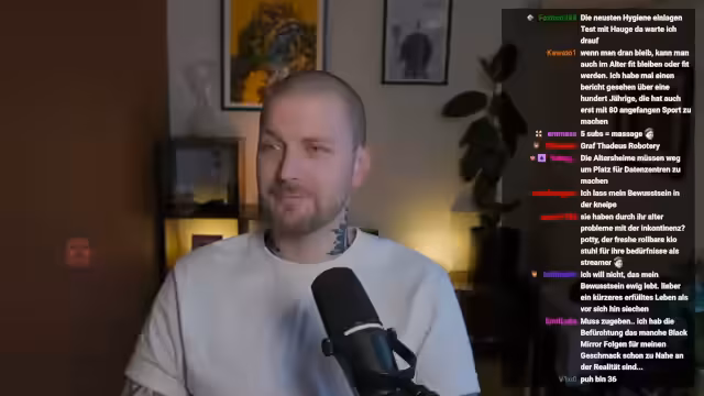 00:59:13Der Streamer diskutiert die Schwierigkeiten, die mit dem Älterwerden einhergehen, wie z.B. Rückenschmerzen und eine abnehmende körperliche Fitness. Er humorvoll betrachtet mögliche zukünftige Technologien wie Roboter, die ihm die Füße massieren, und spekuliert über das Hochladen seines Bewusstseins in die Cloud im Alter. Er stellt in Frage, ob das Erlangen eines Sixpacks ab dem 35. Lebensjahr überhaupt noch möglich ist, gibt aber Ausnahmen zu.