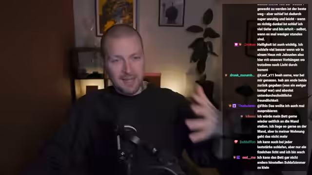 02:57:59Der Streamer gibt detaillierte Tipps zur Verbesserung der Schlafhygiene, die über einfache Maßnahmen wie Magnesium oder Melatonin hinausgehen. Er schlägt vor, eine Stunde vor dem Schlafengehen bereits Zähne zu putzen und sich umzuziehen, um den Körper auf die Nacht einzustimmen. Wichtig sei auch, digitale Geräte aus dem Schlafzimmer zu verbannen und das Licht langsam herunterzufahren. Er berichtet von seiner persönlichen Regel, ab 22 Uhr keine Benachrichtigungen mehr auf dem Handy zu erhalten, außer von seiner Partnerin, Mutter oder in Notfällen. Zudem spricht er über die Bedeutung der Bettposition im Raum, da das Gefühl der Verwundbarkeit, wenn man mit dem Rücken zur Tür schläft, den Schlaf beeinträchtigen kann. Auch die Gestaltung des Schlafzimmers mit angenehmen Bildern, Pflanzen und passender Beleuchtung trägt zum Wohlbefinden und somit zu besserem Schlaf bei. Für kleine Räume empfiehlt er kreative Lösungen wie Moskitonetze, Schlafschals oder variable Lichtsettings, um den Raum optisch zu unterteilen und eine entspannende Atmosphäre zu schaffen.