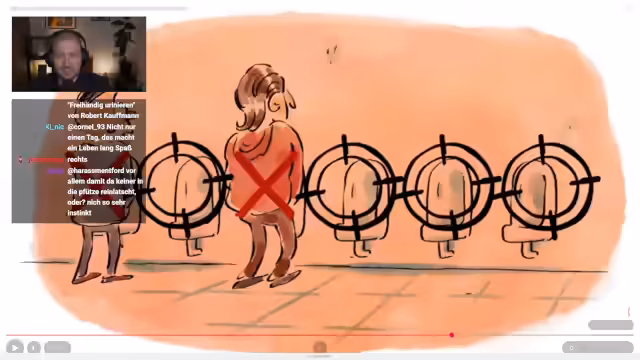 05:51:47Ein kurzes Video über das „Rätsel der Männertoilette“ wird gezeigt, das sich mit der psychologischen Herausforderung des Urinierens in öffentlichen Pissoirs befasst. Es wird thematisiert, dass viele Männer unter Paruresis leiden, einer sozialen Angststörung, die das Wasserlassen in Anwesenheit anderer erschwert oder unmöglich macht. Die Diskussion im Chat bestätigt, dass dies ein weit verbreitetes Problem ist, das oft mit dem Gefühl der Unannehmlichkeit, der Angst vor Blicken oder der Sorge um die Sauberkeit der Einrichtungen verbunden ist. Es werden auch kulturelle Unterschiede in der Toilettennutzung, insbesondere in Japan, aufgezeigt, wo Pissoirs in Parks teilweise ohne räumliche Trennung oder sogar mit Glaswänden zur Außenwelt hin existieren, was für Menschen mit Paruresis extrem belastend wäre. Die absurde Idee eines 'Private P' – eines Umhangs mit Saugnäpfen für die Wand – wird als humorvolle, aber wenig praktikable Lösung präsentiert. Die persönliche Erfahrung des Streamers, der keine Probleme mit öffentlichen Pissoirs hat, führt zu einem Austausch über die unterschiedlichen Empfindungen und die Notwendigkeit von Empathie für dieses oft tabuisierte Thema.