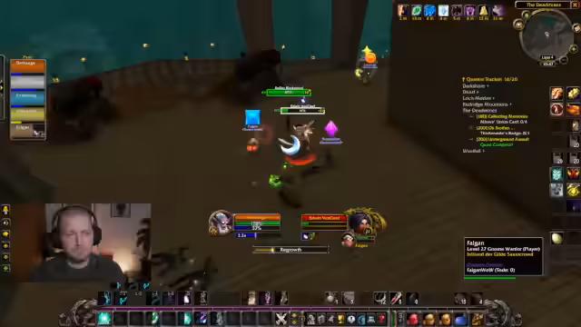 03:52:22Der Stream beginnt mit dem Ausspähen eines anderen Spielers, der unabsichtlich in der Nähe auftaucht. Der Fokus verlagert sich schnell auf das gemeinsame Leveln in der Welt. Es werden Quests wie die Gnollpfoten-Quest angesprochen, die als frustrierend und zeitaufwendig empfunden wird. Besonderes Augenmerk liegt auf denquests nach dem Alkohol, da der Streamer einen Abflugtermin hat und kurzfristig unter Zeitdruck gerät, um noch wichtige Aufgaben zu erledigen.