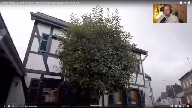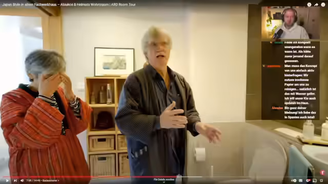 01:50:30Der Streamer startet die Doku "Japan-Style im alten Fachwerkhaus. Atokus und Helmus Wohntraum". Er stellt die Protagonisten Atsuko und Helmut vor, die ein deutsches Fachwerkhaus japanisch gestaltet haben. Er erklärt bereits zu Beginn des Hauses typische japanische Elemente wie den Genkan, den Eingangsbereich, wo man die Schuhe auszieht. Er lobt japanische Badezimmer als platzsparend und überlegen im Vergleich zur deutschen Baupraxis und drückt seine Bewunderung für das Haus aus.