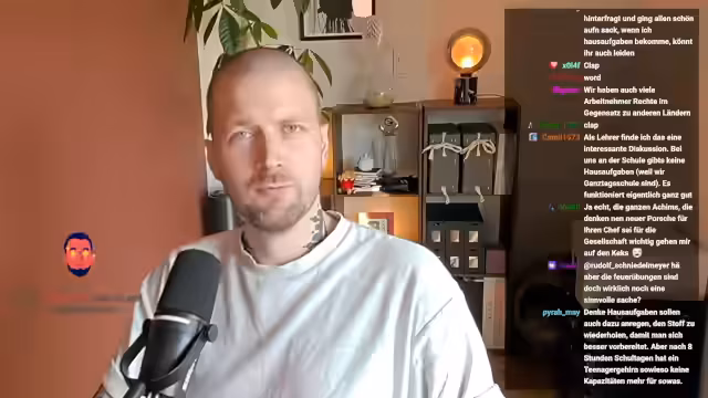 00:56:51Der Streamer blickt auf seine eigene Schulzeit zurück und berichtet, wie er sich in der fünften und sechsten Klasse geweigert hatte, Hausaufgaben zu machen, weil er fand, die Schule sollte das Gelernte in der Unterrichtszeit vermitteln und nicht seine Privatzeit in Anspruch nehmen. Er zieht einen Vergleich zur Arbeitswelt, in der manche Unternehmen nach der gleichen Logik handeln, indem sie zu viel Arbeit aufgeben. Er kritisiert die deutsche Arbeitswelt dafür, dass immer noch vermittelt wird, man solle dankbar für einen Job sein, anstatt das Machtgefälle zwischen Arbeitgebern und Arbeitnehmern offen anzusprechen.