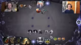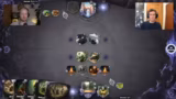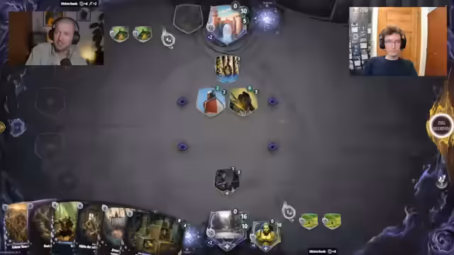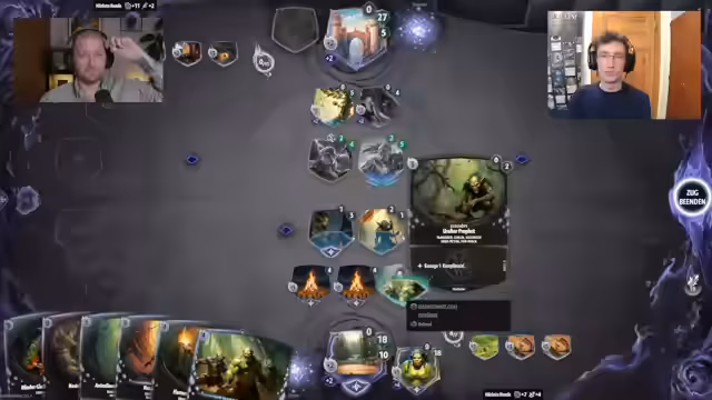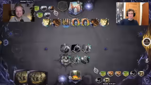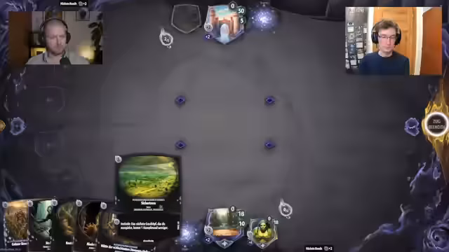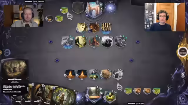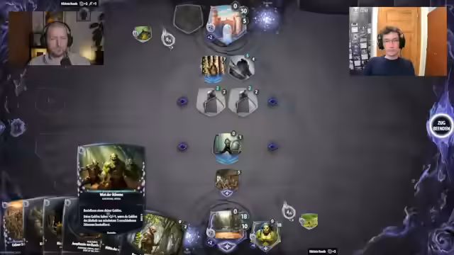 03:23:32Der Streamer spielt gegen den Entwickler Karl eine Demonstration. Der Streamer nutzt die Goblin-Fraktion 'Skuruk', die darauf abzielt, durch das Opfern von Kreaturen schnell viele Goblins zu spawnen und den Gegner zu überrollen. Karl spielt die Elfen-Fraktion 'Fenn'. Es wird die Mechanik des Schadens gezeigt, der auf Karten verbleibt, und das Konzept von 'Fernkampf', das es Kreaturen erlaubt, über die Reihen hinweg anzugreifen. Das Spiel befindet sich noch in der Alpha-Phase, daher sind viele Platzhalter-Grafiken sichtbar.