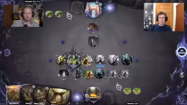 04:49:58Das Spiel zeichnet sich durch ein niedriges Skill-Gap aus, was Anfänger und komplexe Spielsysteme vereint. Elfen-Spieler haben es oft schwer, da sie komplexe Spiele verstehen müssen, während Goblins mit passiven Boni und einfachen Mechaniken starten. Im aktuellen Gameplay konzentriert sich der Streamer auf die Goblin-Fraktion, deren Karten sich selbst spielen, aber wenig aktive Fähigkeiten bieten. Die Herausforderung besteht darin, mit einer schlechten Hand umzugehen und das Spiel trotz begrenzter Ressourcen und Platz im Spielfeld zu gestalten.