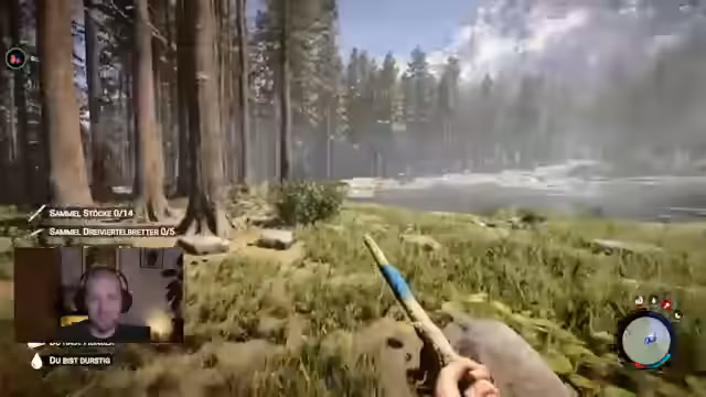 05:10:59Nach der Diskussion um die Grafikeinstellungen kündigt der Streamer an, mit seinen Begleitern in den Bunker zu gehen, um dort Rehe zu jagen. Während der Vorbereitungen wird ein Reh gesichtet, das zunächst wegen der Bewegungsunschärfe unscharf erscheint. Es wird angeschossen, der Speer trifft es jedoch nur, worauf das Reh flieht. Kurze Zeit später wird ein weiteres Reh direkt am Zaun der Basis gesichtet und erfolgreich erlegt.