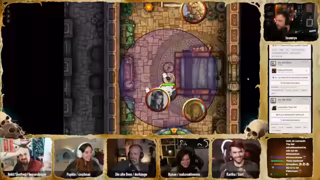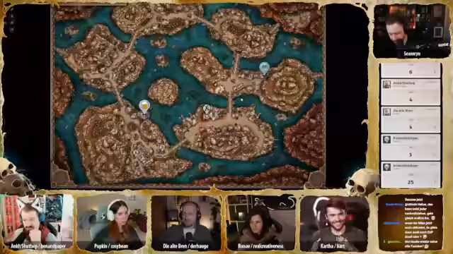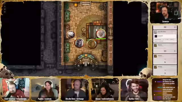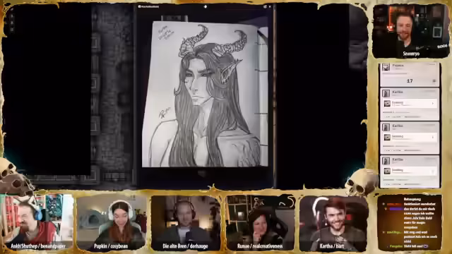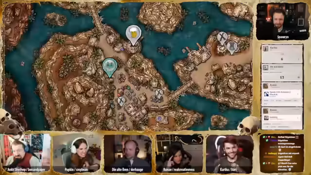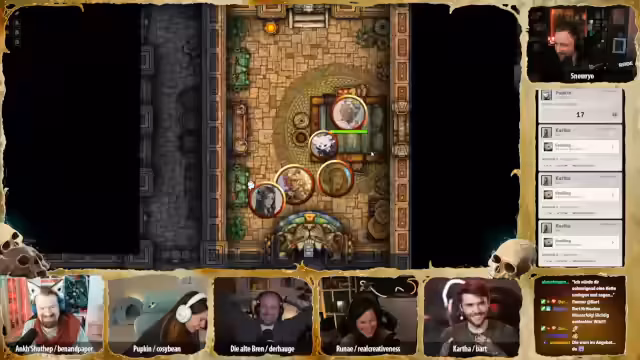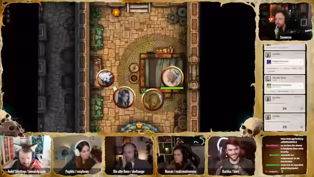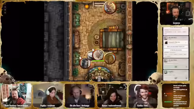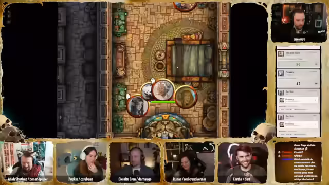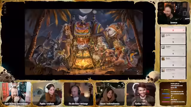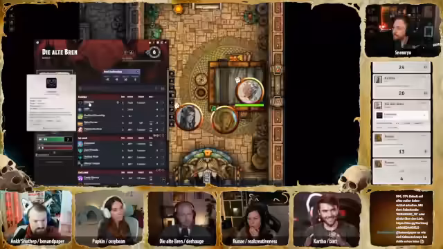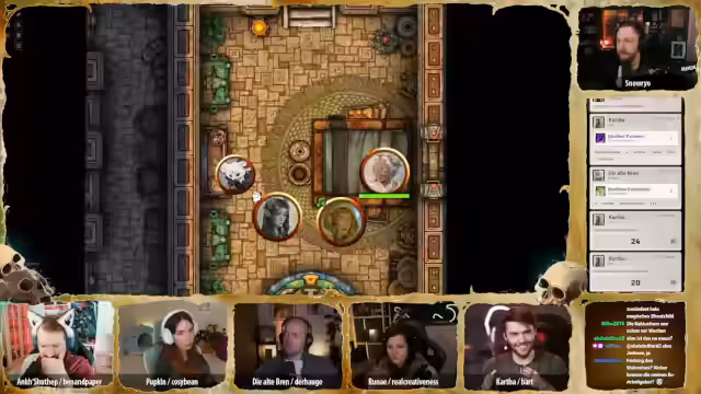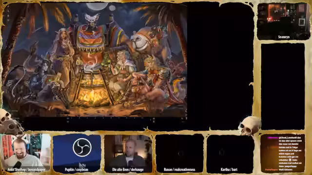 00:37:57Die Pen & Paper Session beginnt mit der Zusammenfassung der Ereignisse: Die Gruppe befindet sich am Tag 22 der Wüstenstürme auf dem Weg nach Wüstenwacht. Runai spürt die Nähe ihres Bruders und macht sich Sorgen. Die Stimmung ist gedrückt, und überall säumen verfaulte Leichen den Weg. Sie finden Zombie-Hühner und einen Geier, die einzigen Lebewesen in der Umgebung. Der Shop von Dothrok Flatterfau, einem Experten für Teleportation und Archäologie, wird gefunden, in der Hoffnung, Informationen über die Geschehnisse zu erhalten. Doch auch er und Bruneis Bruder scheinen tot zu sein, wobei der Bruder noch lebt und von einer Prophezeiung des Pharaos krächzt, der ihn und seine Schwester gleichzeitig töten will. Der Teleportationszirkel ist zerstört und muss repariert werden. Nach einer erfolgreichen Teleportation landet die Gruppe in Glimmerscale, einem bekannten Ort. Die Ankunft ist chaotisch, einige Spieler sind bewusstlos oder haben starke Kopfschmerzen. Runai wird mit Heilzaubern versorgt, und die Gruppe stellt fest, dass Hügelchen, ein Kamel, nicht mitteleportiert wurde. Sie beschließen, den Teleportationszirkel zu reaktivieren, um Hügelchen zurückzuholen, aber der Streamer warnt, dass das Haus, in dem sie sich befinden, beim Teleportieren zusammengefallen ist. Die Gruppe versucht, den Zirkel zu reparieren, während sie den Geruch von Verwesung wahrnehmen und feststellen, dass ein fremder Einfluss auf den Zirkel wirkt.