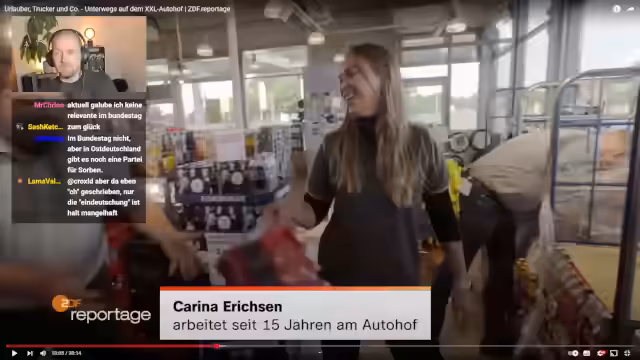 02:39:54Die Aufmerksamkeit richtet sich auf Marie, die als Lagerchefin im Supermarkt des Autohofs während der Urlaubszeit eine Schlüsselrolle spielt. Sie muss den Überblick über tausende von Wareneingängen behalten und springt überall ein, wo Unterstützung benötigt wird. Der Streamer unterhält sich mit dem Publikum über Süßigkeiten und teilt persönliche Kindheitserinnerungen. Er erzählt von einem Glücksfall, bei dem ein kaputter LKW kostenlose Snacks verteilte, und erinnert sich an die harte Konkurrenz mit seinen Geschwistern und Cousins um Süßigkeiten, die ihn zwang, auch Geschmäcker zu mögen, die er nicht liebte.