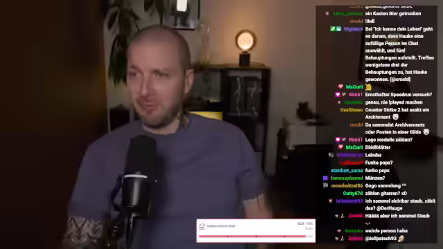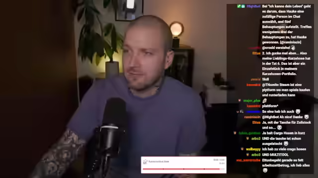 02:59:22Es wird eine neue Runde Hitme mit dem Gewinner Etos gestartet, nachdem die vorherige Runde im 'Versagen' endete. Es werden neue Behauptungen über Etos aufgestellt, um herauszufinden, wie gut der Streamer ihn einschätzen kann. Die Behauptungen umfassen, dass Etos in seinem Leben noch nie mit einem Langstreckenbus gefahren ist, keine kurze Hose besitzt, die weniger als fünf Taschen hat, dreimal das gleiche Paar Vans oder Chucks gekauft hat, dieses Jahr noch keinen Döner mit Knoblauchsoße gegessen hat und weniger als zehn Spiele in seiner Steam-Bibliothek installiert hat. Es wird betont, dass die Behauptungen mutig und unterhaltsam sein sollen, und Etos wird aufgefordert, ehrlich zu antworten. Der Streamer wettet mit Etos um einen Game-Key, falls er alle fünf Behauptungen richtig errät.