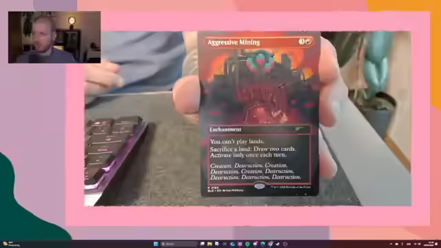 00:42:03Zunächst wird das Spider-Man Pre-Release-Kit vorgestellt, wobei der Streamer zugibt, das Set uninteressant zu finden. Vier Karten werden hervorgehoben: Ghost Spider Gwen Stacy, Double Trouble, die maskierte Mieze und der Spiderbot. Es wird kritisiert, dass das Set wenig Mühe zeigt, sich ins Magic-Universum einzufügen, und die Mechaniken als langweilig empfunden werden. Im Anschluss wird ein Secret Lair präsentiert, eine Sammlung von Karten mit alternativen Artworks. Gezeigt werden Aggressive Mining, Reprocess, Zuran Orb, Crucible of Worlds und der Silvern Safekeeper. Zusätzlich wird eine Planes-Karte in Foil gezeigt. Abschließend wird Jolrael, die Stimme von Salfir, vorgestellt, eine Limited-Karte von einer Messe, die Lena mitgebracht hat.