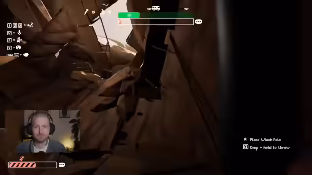 01:20:51Zu Beginn des Stream-Ausschnitts befindet sich eine Spielfigur in einem dunklen, unübersichtlichen Gelände, das stark an eine Wald- oder Höhlenumgebung erinnert. Die schlechte Sichtbarkeit im Spiel erschwert die Orientierung, und die Spieler verlieren aufgrund der Dunkelheit und unübersichtlicher Steilhänge den Sichtkontakt zueinander. Es kommt zu mehreren ungewollten Abstürzen in Löcher, was die Hauptaufgabe in diesem Abschnitt ausmacht: den verlorenen Mitspieler wiederzufinden und aus der misslichen Lage zu befreien.