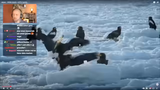 01:38:37Der Streamer berichtet über die beeindruckende Vogelwelt an der Küste von Hokkaido, insbesondere über die Riesenseeadler. Rund ein Drittel aller Riesenseeadler der Welt zieht im Herbst in diese Region. Es gibt zwei Arten von Adlern, die hier überwintern: die Stellar-Sea-Eagles und die Weißkopfseeadler. Die Adler ernähren sich hauptsächlich von Fischen, aber die Nahrungskonkurrenz unter ihnen ist hart und die Kämpfe können sogar blutig enden.