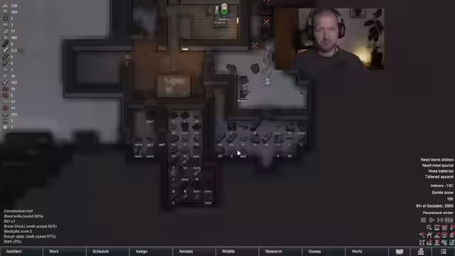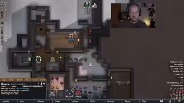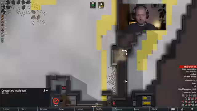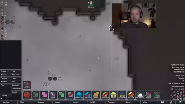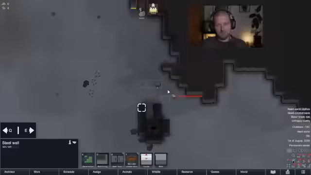 02:18:00Im weiteren Verlauf des RimWorld-Streams konzentriert sich der Streamer auf das Management seiner Ressourcen und das Ausbauen der Basis. Er sammelt Silber, baut eine Schlachtbank und eine Kühlkammer und kümmert sich um die Versorgung seiner Kolonisten mit Nahrung. Auch werden strategische Entscheidungen getroffen, wie die Platzierung von Einrichtungen und die Nutzung der vorhandenen Ressourcen optimal zu nutzen, um den Winter zu überstehen.