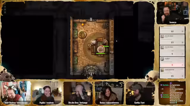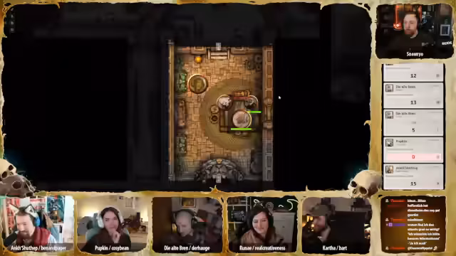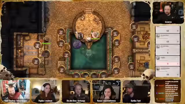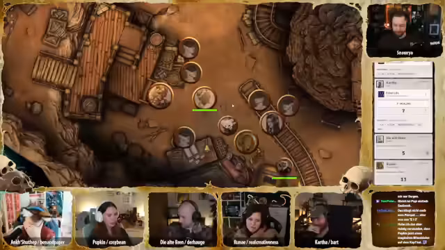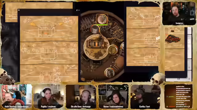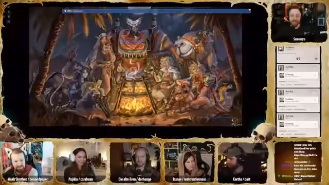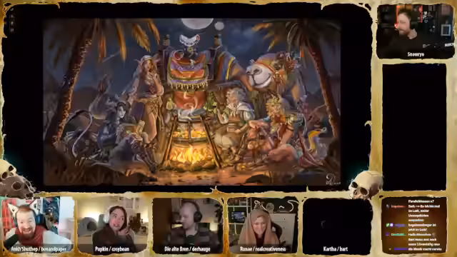 02:29:52Der Tüftler von Dieselheim bietet an, ein Gerät zu basteln, das vor Blitzen schützt. Er schlägt den Bau einer kleinen Antenne vor, die als Blitzableiter für eine Person dienen könnte. Die Gruppe beschließt, dass dies bis zum nächsten Abend fertiggestellt und zum Zug gebracht werden soll, wobei die Werkstätten der zwölf Neblin genutzt werden sollen. Carver bedankt sich bei allen für die Hilfe und scherzt über die Möglichkeit, die Gräber zu pflegen, falls sie die Mission nicht überleben. Es folgt eine lange Präsentation von Fanart, darunter eine detaillierte Zeichnung von Ank mit all ihren Trinkets, eine unheimliche Augenkrähe, eine Darstellung der Kotschlange, die der Gruppe fast zum Verhängnis wurde, und ein beeindruckendes Bild von Totschmut. Weitere Kunstwerke zeigen Brenn und Hügelchen in einem einzigartigen Stil, eine dynamische Darstellung von Runae mit Sandmagie und ein Lo-Fi-Bild von Katha, das als Desktop-Hintergrund vorgeschlagen wird. Ein Tagebuch von Ank mit dem Titel „Ich Hase Erdmännchen“ sorgt für Heiterkeit, gefolgt von einem Gruppenbild im Puppenstil und einer humanoiden Version von Hopkin. Abschließend wird ein Kunstwerk von Bonifatius als Magic-Karte präsentiert, das große Begeisterung hervorruft. Die Vielfalt und Qualität der Fanarts unterstreicht die Kreativität und das Engagement der Community.