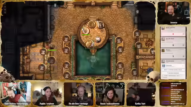 00:36:24Nach der Rückkehr nach Glimmerscale durch einen reparierten Teleporter fassen die Abenteurer ihre jüngsten Entdeckungen zusammen. Sie haben Flatterfausts Buch, eine Karte und eine Schablone gefunden, die an Artefakte von Runai erinnern. Eine Schriftrolle zur Aufhebung eines Fluches wurde ebenfalls entdeckt, die möglicherweise für Geronais versteinerten Bruder nützlich sein könnte. Es gibt Hinweise darauf, dass der Pharao, der einst das Land in Krieg stürzte, nach der Festung des Wahnsinns sucht und einen Schlüssel besitzt, der sich noch in seinem Grab befindet. Die Gruppe ist sich uneinig, ob sie dem Pharao gewachsen ist und ob sie rechtzeitig zum Grab gelangen kann, um die drohende Katastrophe abzuwenden. Der Auftrag des DMs wurde präzisiert: Es geht nicht nur darum, die Ursache der Ereignisse herauszufinden, sondern diese auch aufzuhalten. Es wird auch erwähnt, dass Hügelchen, ein Kamel, zurückgelassen wurde, aber man ist zuversichtlich, dass es stark genug ist, um zurückzukehren. Der DM erinnert die Gruppe an die Belohnungen für ihre Mission, einschließlich des Rechts, alle Funde aus den Gräbern zu behalten.