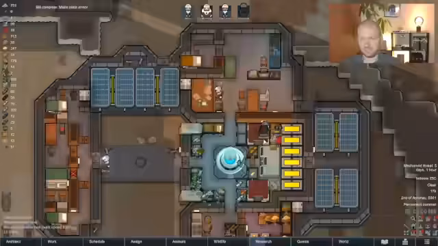 01:24:31Organe, darunter eine Lunge, werden an einen Händler verkauft, um dringend benötigte Medizin und einen weiteren Arzt zu finanzieren. Die Langzeitplanung schließt den Bau von Bolt-Action-Riflen und das Beschäftigen der Kolonisten mit sinnvollen Aufgaben wie dem Abbau von Ressourcen ein. Die 'Arschbolzen' steht kurz vor dem Start, um den Planeten zu verlassen.