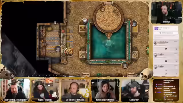 03:29:03Nach einer Pause und dem Zeigen von Fanart setzt die Gruppe ihre Ermittlungen an der Tür zum verbotenen Gang fort. Katha führt einen Arcana-Check durch, während Puppi nach Fallen sucht. Die Proben sind sehr erfolgreich mit Werten von 24 und 26, was auf eine professionelle Untersuchung hindeutet und die Möglichkeit aufdeckt, dass die Geschichte der Käferköpfe weitergehen könnte.