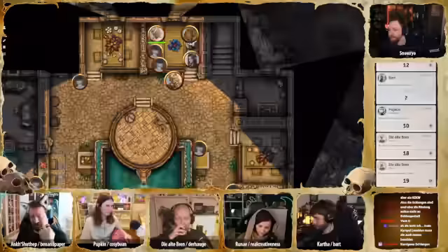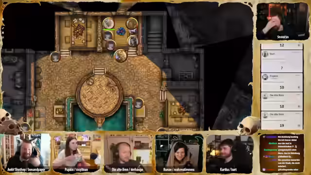 03:41:29Eine mit Magie versiegelte Tür öffnet sich nach einem Wiederholungswurf, der eine 15 bringt. Der Charakter Papkin nutzt eine Bonusaktion, um sich unsichtbar in der Nähe der Tür zu verstecken. Gleichzeitig reißt der Kopf von Tobren, der sich im Inneren befindet, in Richtung der sich öffnenden Tür. Papkin beginnt, sich unauffällig auf die Leiter zu bewegen, um sich der Statue zu nähern und aus dem direkten Angriffsbereich zu kommen. Die Szene ist von Spannung und dem Bedürfnis nach Tarnung geprägt.