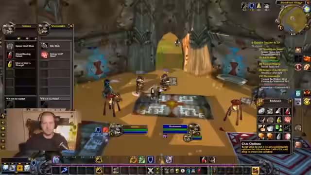 00:25:11Es folgt die Erstellung des Charakters, ein männlicher Tauren-Schamane namens Totanker, angelehnt an Tatonka. Nach der Charaktererstellung betritt Totanker die Spielwelt, wo bereits andere Gildenmitglieder warten. Es gibt anfängliche Schwierigkeiten mit der Audioeinstellung des Proximity Voice Addons, die aber vorerst ignoriert werden. Die Gildenmitglieder sind auf der Karte durch MapMate sichtbar. Die Chat-Einstellungen werden angepasst und wichtige Makros für den Schamanen vorbereitet. Es wird kurz der Discord-Channel erwähnt, um die Kommunikation zu vereinfachen. Nach anfänglichen Schwierigkeiten mit Einstellungen und Addons beginnt das gemeinsame Questen und Leveln mit anderen Gildenmitgliedern. Dabei werden die ersten Quests angenommen, Autoloot aktiviert und die Steuerung angepasst. Die ersten Mobs werden besiegt und es wird über die hohe Respawn-Rate der Gegner auf den Anniversary-Realms gesprochen.