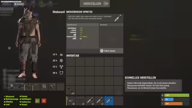 09:01:56Ein Spieler fungiert als Händler, indem er Ausrüstung wie Metzger, Munition und Spritzen an seine Teammitglieder verteilt. Er fährt mehrmals zurück, um Nachschub zu holen und das Team mit notwendigen Ressourcen zu versorgen. Dies ermöglicht es dem Team, sich trotz hoher Verluste neu zu bewaffnen und für den nächsten Einsatz bereit zu machen.